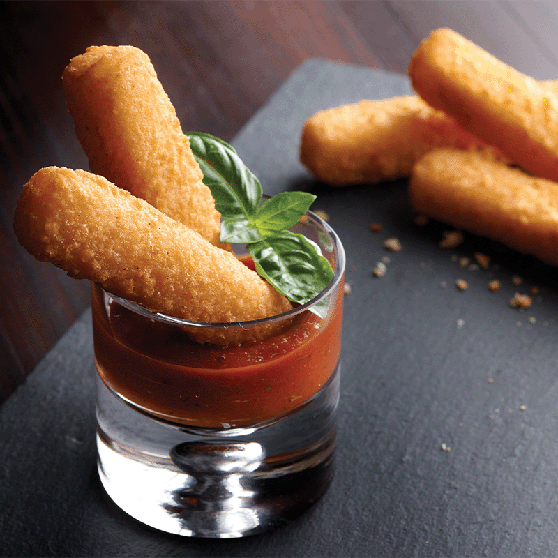 Real Cheese Breaded Appetizers. Freezer to oven, freezer to fryer or freezer to rapid baking oven. Crafted with a premium 4-cheese blend of Asiago, Ricotta, Romano, and Parmesan. Signature seasoned breadcrumb coating featuring garlic powder, parsley, Romano cheese, and a touch of brown sugar. Par-fried for easy preparation in Impinger ovens, conventional ovens, rapid cooking ovens, and deck pizza ovens. Ideal for bar & grills, convenience stores, casual dining, pizza & Italian restaurants