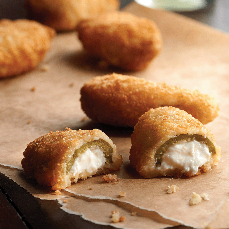 Cream cheese stuffed brined Jalapenos in a crispy potato crumb coating. Filling should be creamy, yet not runny, with a mild cream cheese flavor.