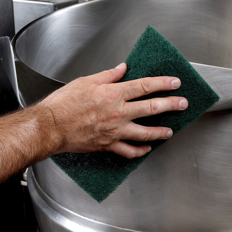 Heavy duty scouring pads designed for cleaning stubborn baked on food from commercial kitchen cookware.